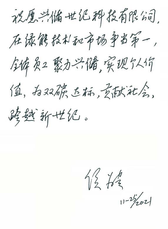 “祝愿興儲世紀科技有限公司,在綠能技術和市場爭當第一,全體員工聚力興儲,實現(xiàn)個人價值,為雙碳達標,貢獻社會,跨越新世紀?!?