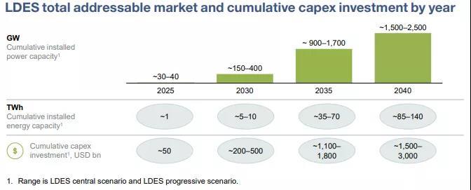 l 長時儲能的部署勢頭日益強勁,在過去五年中,長時儲能技術公司的投資約為30億美元,預計到2025年,全球部署長時儲能的容量將達到25-35GW/1TWh,投資約為500億美元。