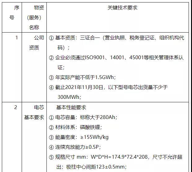 招標要求磷酸鐵鋰電池單體大于280Ah,能量密度≥155Wh/kg,連續(xù)充放能力≥0.5P,且日歷壽命不低于15年。