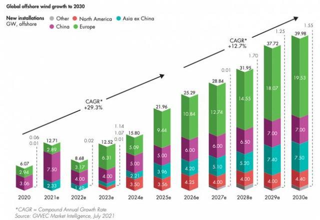 GWEC預計,未來十年,全球?qū)⒗塾嬓略龀^235吉瓦的海上風電裝機,使得全球風電累計裝機容量在2030年達到270吉瓦。