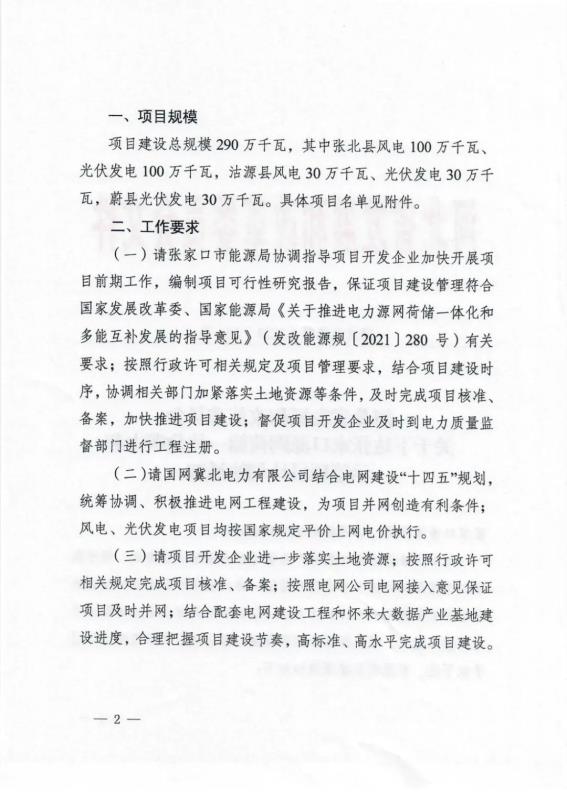 同時請國網(wǎng)冀北電力有限公司結(jié)合電網(wǎng)建設(shè)“十四五”規(guī)劃, 統(tǒng)籌協(xié)調(diào)、積極推進電網(wǎng)工程建設(shè),為項目并網(wǎng)創(chuàng)造有利條件;風電、光伏發(fā)電項目均按國家規(guī)定平價上網(wǎng)電價執(zhí)行。