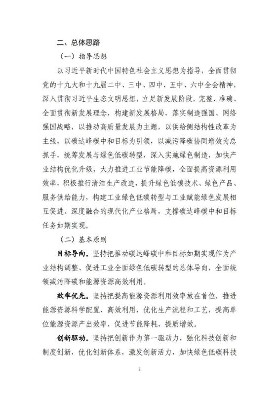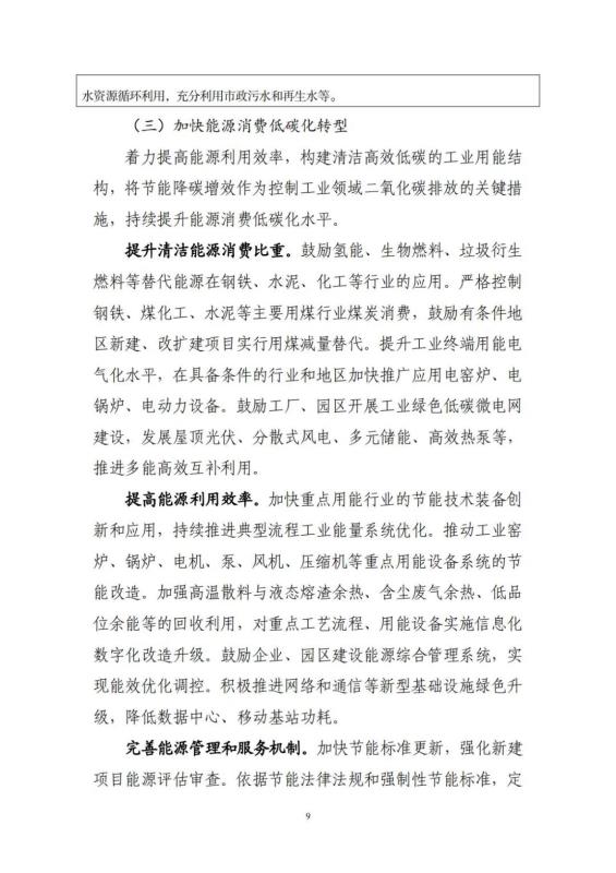 提高可再生能源應(yīng)用比重和提升清潔能源消費(fèi)比重;加快氫能技術(shù)創(chuàng)新和基礎(chǔ)設(shè)施建設(shè),推動(dòng)氫能多元利用;鼓勵(lì)氫能等替代能源在鋼鐵、水泥、化工等行業(yè)的應(yīng)用;提升工業(yè)終端用能電氣化水平;鼓勵(lì)工廠、園區(qū)開展工業(yè)綠色低碳微電網(wǎng)建設(shè),發(fā)展屋頂光伏、分散式風(fēng)電、多元儲(chǔ)能、高效熱泵等,推進(jìn)多能高效互補(bǔ)利用。