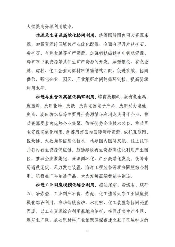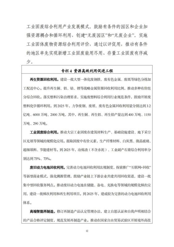 推進(jìn)再生資源高值化循環(huán)利用。鼓勵(lì)建設(shè)再生資源高值化利用產(chǎn)業(yè)園區(qū),推動(dòng)企業(yè)聚集化、資源循環(huán)化、產(chǎn)業(yè)高端化發(fā)展。統(tǒng)籌布局退役光伏、風(fēng)力發(fā)電裝置、海洋工程裝備等新興固廢綜合利用。積極推廣再制造產(chǎn)品,大力發(fā)展高端智能再制造。