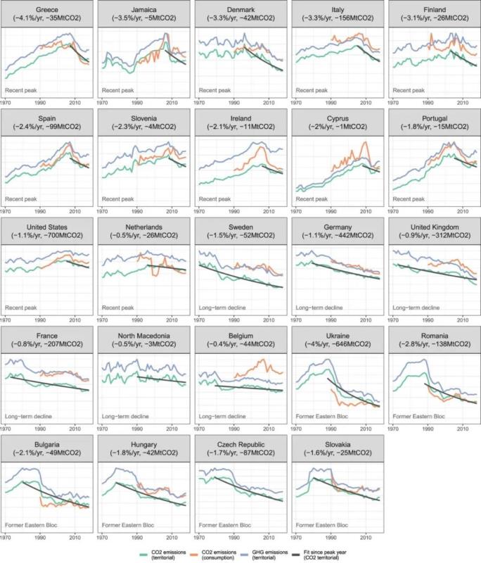 研究表明,24個領(lǐng)先者分為三組:6個早在20世紀70年代就達到峰值的早期起步者,6個在20世紀90年代迅速減少排放量并從那時起一直在下降的前東方集團國家,12個晚起步者僅在21世紀初達到峰值。烏克蘭(自1988年以來下降了77%)、丹麥(自1996年以來下降56%)、英國(自1973年以來下降了46%)、德國(自1979年以來下降了37%)和美國(自2005年以來下降了12%)是自達峰以來減排幅度較大的國家。在發(fā)展中國家中只有牙買加,這主要是由于其全球重要的鋁土礦采礦部門的燃料節(jié)約。