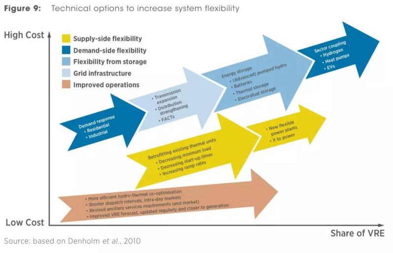 這么大比例的間歇性可再生能源要求電網(wǎng)具有更大的靈活性。根據(jù)IRENA的引用專家的觀點(diǎn),電網(wǎng)擁有更大的靈活性有五種途徑,按照成本(從低到高)排列如下: