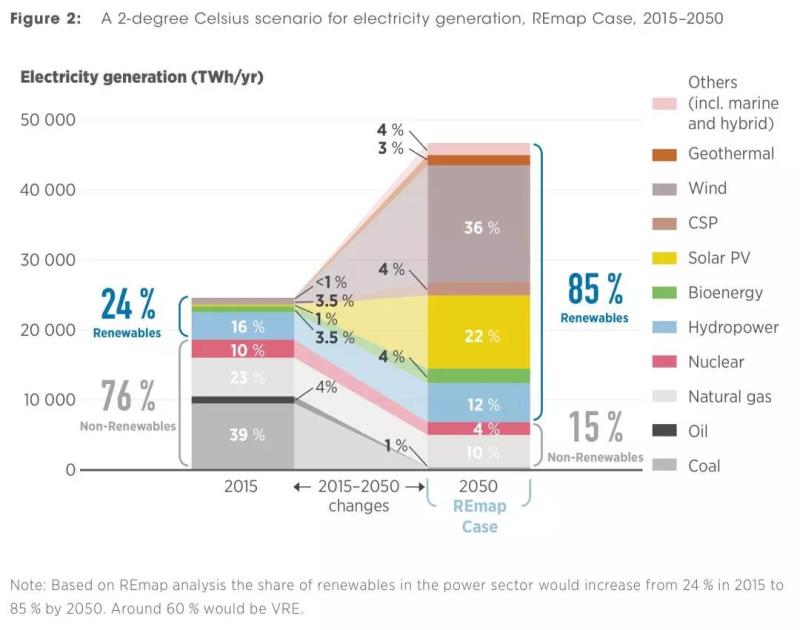 中國(guó)儲(chǔ)能網(wǎng)訊:按照國(guó)際可再生能源署(IRENA)發(fā)表的一份報(bào)告中,如果全球溫升控制在2攝氏度以內(nèi),要求2050年全球電力供應(yīng)的85%來(lái)自可再生能源,其中間歇性電源占58%(風(fēng)電36%、光伏22%),其余11%為化石能源、4%為核電。