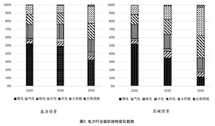 圖3展示了基準情景和零碳情景下,2020—2050年期間,電力行業(yè)裝機結構變化趨勢。電力行業(yè)的低碳轉型,一方面,要不斷加大可再生能源發(fā)電的占比??梢钥吹?,在基準情景下,2030年可再生能源裝機只有41.8%,2050年達到57.9%;而在零碳情景下,2030年可再生能源裝機就達到了53.7%,2050年更是達到78.2%。另一方面,要加快煤電淘汰,并普及CCS技術的使用。在零碳情景下,到2050年的煤電和天然氣發(fā)電機組全部裝配有CCS技術,以此來保證實現(xiàn)零排放的目標。另外,為了滿足減排目標要求,在零碳情景下,未來風能和太陽能裝機的擴張速度需要提高到現(xiàn)在水平的3倍左右。