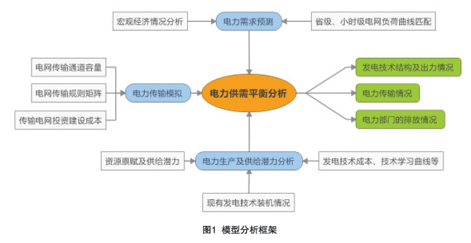 根據電力行業(yè)特點,模型的分析框架包含電力需求模塊、電力生產模塊以及電力傳輸模塊三大部分(圖1)。電力需求模塊根據人口、產業(yè)、技術、城鎮(zhèn)化水平等宏觀經濟分析數據,結合省級電網負荷曲線展望未來省級區(qū)域分部門的用電需求結構及趨勢。電力生產是模型分析的核心,以小時級的時間尺度為分析基礎,詳細描述32個省級區(qū)域的18種發(fā)電技術組合,分析各省級區(qū)域的發(fā)電技術裝機結構及發(fā)展趨勢,各發(fā)電技術的出力及發(fā)電順序等。電力傳輸模塊主要關注未來區(qū)域間電力傳輸通道的投資建設成本,以及省級和大電網區(qū)域間的電力傳輸規(guī)則、傳輸通道容量等。核心分析在于省級區(qū)域電網傳輸規(guī)則矩陣構建,輸出電力傳輸約束條件。