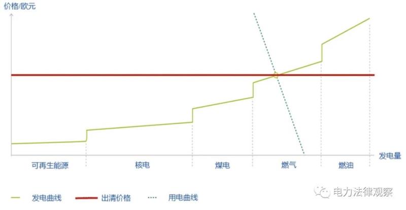 日前市場的競爭機(jī)制按照按邊際成本(燃料和排放成本)排序,其中可再生能源發(fā)電的邊際成本為零,核電較低,煤電較高,燃?xì)獍l(fā)電更高,燃油發(fā)電的邊際成本最高。日前市場的價格機(jī)制采用按用電需求統(tǒng)一出清的方法(圖四)。市場需要的發(fā)電量按邊際成本排序,一直排到滿足負(fù)荷需求為止。這時的電價被稱為出清價格。如果出清價格是燃?xì)獍l(fā)電的邊際成本,那么煤電、核電和可再生能源發(fā)電都得到統(tǒng)一價格的發(fā)電費(fèi)用,所以在圖三的例子里可再生能源的發(fā)電收入實際上是燃?xì)獍l(fā)電最高的中標(biāo)價格。不過可再生能源的能源密度低于其它傳統(tǒng)能源,每發(fā)一千瓦時的電必須比用燃煤或燃?xì)獍l(fā)電投入更多的材料和能源,使得發(fā)電的投資成本一開始很高,所以德國政府制定的補(bǔ)貼高于市場價格。這也是補(bǔ)貼和市場之間的關(guān)聯(lián)關(guān)系。