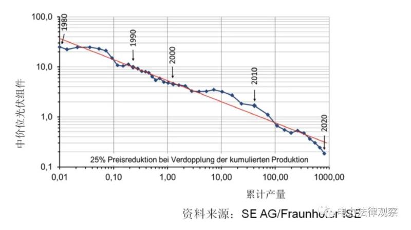 光伏組件價格不斷地下降,數(shù)量每翻一番價格就會下降25%(圖二),超過了德國價格控制模型中對光伏價格的預(yù)估。結(jié)果價格控制模型果然出了典型的風(fēng)險問題,即光伏發(fā)電補(bǔ)貼的數(shù)量失控。2009年以后,由于光伏發(fā)電補(bǔ)貼過多,造成電價迅速上漲(圖一中紅色曲線的第一次上升部分)。德國政府 2012年修改了價格控制模型中光伏價格的模型,降低了對光伏的補(bǔ)貼(圖一中紅色曲線的第一次平緩部分)。針對可再生能源的波動性引起的電力系統(tǒng)平衡能量逐漸地增多,德國政府又對可再生能源上市實行了義務(wù)制和獎勵制,發(fā)揮了具有自平衡機(jī)制的電力市場的作用,減低了對電力系統(tǒng)平衡能量的需求[3],但是能源密集型產(chǎn)業(yè)的免稅使分?jǐn)偟狡渌I(yè)和居民的電費(fèi)成倍上漲(圖一中紅色曲線的第二次上升部分)。當(dāng)時德國政府的定價原則是補(bǔ)貼應(yīng)高于現(xiàn)貨市場價格。由于可再生能源越來越多,現(xiàn)貨市場價格下降得越厲害,所以大多數(shù)可再生能源的持有者還是選擇繼續(xù)拿補(bǔ)貼。雖然平衡市場有了一直激勵的機(jī)制,但現(xiàn)貨市場仍然沒有什么起色,也沒有解決電價居高不下的困局。德國政府2014年不得不又重新修訂可再生能源法,要求自備電廠也必須繳納可再生能源能源“稅”(能源密集型產(chǎn)業(yè)除外),限制不合理的“避稅”的情況。