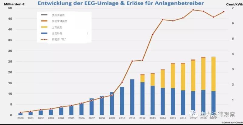 2017年風(fēng)電的價格開始接近化石能源,德國政府再一次修改可再生能源法,從以前的價格控制模型改為數(shù)量控制模型?;旧鲜菍r格視為市場反應(yīng),將數(shù)量視為政府要求(而不是像以前那樣反過來)。招標(biāo)改為拍賣的方式后,小公司利用利潤低中標(biāo)居多。2017年的可再生能源法還引入了補(bǔ)貼市場直銷的激勵原則。如果可再生能源發(fā)電直銷現(xiàn)貨市場,從市場獲得的盈利低于固定補(bǔ)貼,差值部分由政府補(bǔ)齊。明顯不同于其它國家的是,如果市場獲得的盈利高于固定補(bǔ)貼,增值部分不必上交。這一市場激勵方式被認(rèn)為是卓有成效的,有效地抑制了可再生能源“稅”的繼續(xù)上漲(圖一中紅色的補(bǔ)貼曲線再次平緩),成為德國可再生能源高消納的一個秘訣。