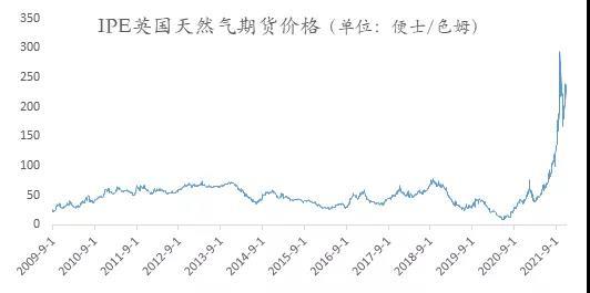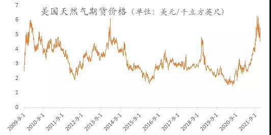 全球主要經(jīng)濟(jì)體加速能源轉(zhuǎn)型,天然氣作為相對低碳的傳統(tǒng)能源呈現(xiàn)結(jié)構(gòu)性需求增加趨勢,特別是隨著歐洲碳價大幅走高,天然氣發(fā)電較煤電的經(jīng)濟(jì)性更為凸顯,天然氣愈發(fā)供不應(yīng)求。在能源需求增長、極端天氣和貨幣增發(fā)等多種因素共同作用下,天然氣短缺和價格飆升成為引發(fā)歐洲乃至全球能源市場震蕩的重要因素。2021年年初至9月,歐洲天然氣價格上漲600%,批發(fā)電價上漲200%,其中英國天然氣期貨價格10月初的最高點較上年同期增長700%(見圖1),電價也同比增長了7倍。因擔(dān)憂歐洲天然氣短缺危機(jī)蔓延,美國天然氣期貨價格創(chuàng)12年以來新高(見圖2),大幅增加了天然氣取暖和發(fā)電成本。10月份,在俄羅斯表態(tài)增加對歐天然氣出口后,歐洲天然氣價格出現(xiàn)大幅回落,英國天然氣期貨價格從最高點下跌43%,此后又重拾升勢,11月中旬回到了9月份高點。