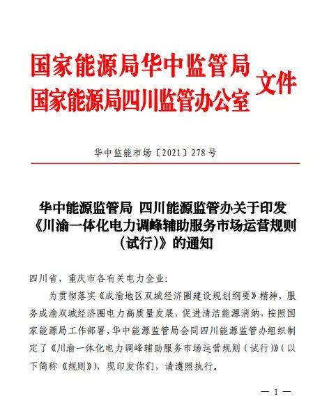 據(jù)此,華中能源監(jiān)管局積極落實中央和國家能源局決策部署,結(jié)合川渝電力一體化發(fā)展新形勢,會同四川能源監(jiān)管辦組織川渝地區(qū)相關(guān)電力企業(yè)及時制訂了《川渝一體化電力調(diào)峰輔助服務(wù)市場運營規(guī)則(試行)》。