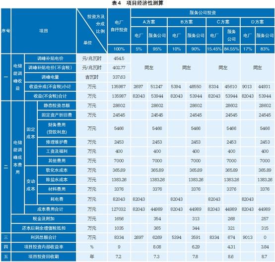 在項目投資內(nèi)部收益率(稅前)9%滿足調(diào)峰補(bǔ)貼電價收益的基礎(chǔ)上,比較“電廠自行投資”和采用合同能源管理經(jīng)營模式由“服務(wù)公司投資”建設(shè)運(yùn)營兩種方式,考慮A、B、C、D四個分成方案,項目經(jīng)濟(jì)性測算見表4。