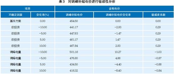 敏感性分析。當(dāng)項目投資內(nèi)部收益率(稅前)9%時,影響項目經(jīng)濟(jì)性較敏感因素——總投資、調(diào)峰電量變化±5%、±10%情況下對調(diào)峰補(bǔ)貼電價進(jìn)行敏感性分析。