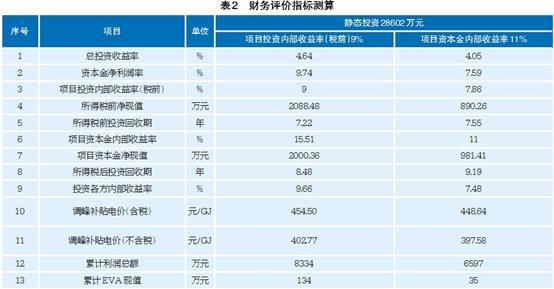 財務(wù)評價指標(biāo)測算。在項目投資內(nèi)部收益率(稅前)9%、項目資本金內(nèi)部收益率11%的條件下分別反算調(diào)峰補(bǔ)貼電價,測算財務(wù)評價指標(biāo)見表2。