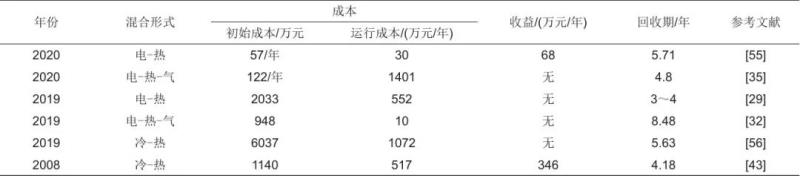 經(jīng)濟性分析對混合儲能系統(tǒng)的推廣和工程應用至關重要。通過總結近年來發(fā)表文獻,得到混合儲能系統(tǒng)經(jīng)濟性分析情況如表1所示?;旌蟽δ芟到y(tǒng)的成本主要由初始成本和運行成本組成,初始成本指設備購買費用,運行成本包括購電、購氣費用,儲能設備的運行損耗,能量損耗成本等。儲能設備的種類越多,初始成本也就越高,但通過合理優(yōu)化調度,運行費用會隨之降低。文獻以中國北方某酒店為例,通過應用一種兩階段運營優(yōu)化方法,蓄熱/冷罐的引入使得系統(tǒng)運行成本降低了7.7%?;旌蟽δ芟到y(tǒng)的盈利主要包括通過分時電價的獲利、消納棄風棄光、向電網(wǎng)售賣多余電力等。影響系統(tǒng)的經(jīng)濟性因素主要有可再生能源發(fā)電及負荷的不確定性、分時電價、天然氣價格、熱電聯(lián)產(chǎn)規(guī)模、儲能設備大小、運行模式等。系統(tǒng)性能和經(jīng)濟性是相輔相成的關系,但如果平衡不好,系統(tǒng)則無法高效經(jīng)濟運行,文獻通過模擬計算發(fā)現(xiàn)系統(tǒng)運行經(jīng)濟性與新能源消納兩者之間存在明顯矛盾,當經(jīng)濟性要求得到滿足時,風電消納水平嚴重不足;當關注風電消納時,運行成本又會居高不下,因此如何平衡好系統(tǒng)性能和經(jīng)濟性之間的關系還需深入研究。