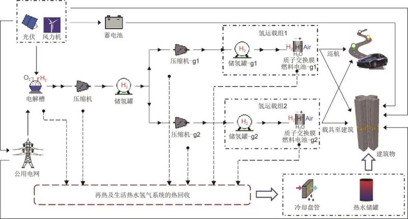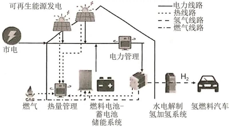 此外,近年來隨著電動汽車的快速發(fā)展,也有研究建筑供能系統(tǒng)中納入以氫為燃料的電動汽車的相關研究。如圖3所示,風光可再生能源發(fā)電系統(tǒng)提供電力驅動產(chǎn)生氫氣為電動汽車提供氫能,同時產(chǎn)生電力為建筑提供電能,既節(jié)約了管路建設成本,又減少了碳排放量。