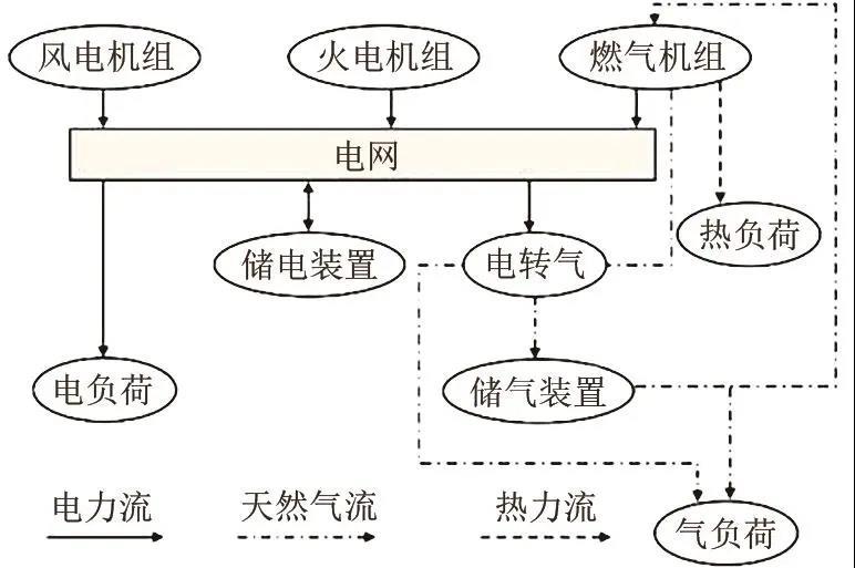 電-氣混合儲能系統(tǒng)通過耦合元件將電力系統(tǒng)和燃氣系統(tǒng)連接起來,經(jīng)過設計規(guī)劃系統(tǒng)配置和調度運行,充分發(fā)揮各自能源的優(yōu)勢,在保證系統(tǒng)穩(wěn)定性的同時提高了綜合能源利用效率。