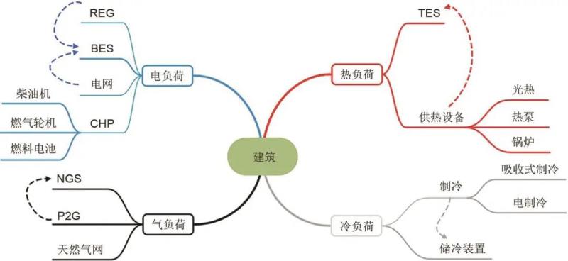 從建筑能源系統(tǒng)的構成角度分析,建筑能源系統(tǒng)由供能設備、輸能網(wǎng)絡、用戶和儲能設備組成。其中供能設備主要包括:①用于電-熱/冷能量耦合的電鍋爐,熱泵,壓縮式制冷機,吸收式制冷機等;②用于電-氣能量耦合的P2G設備;③用于氣-熱能量耦合的燃氣鍋爐;④用于電-熱-氣或電-熱-冷-氣能量耦合的熱電聯(lián)產(chǎn)系統(tǒng)和熱電冷三聯(lián)供系統(tǒng),其中主要的設備有燃氣輪機和燃料電池等。儲能設備主要包括:①用于儲電的蓄電池;②用于蓄熱/冷的蓄熱罐;③用于儲氣的儲氣罐。有時基于建筑條件和系統(tǒng)運行的經(jīng)濟性,也會使用管道儲存天然氣或氫氣。