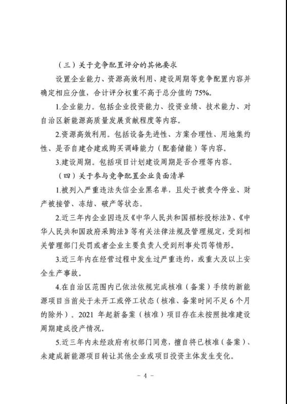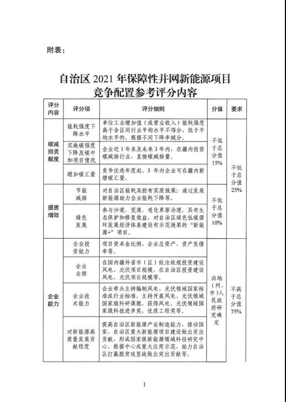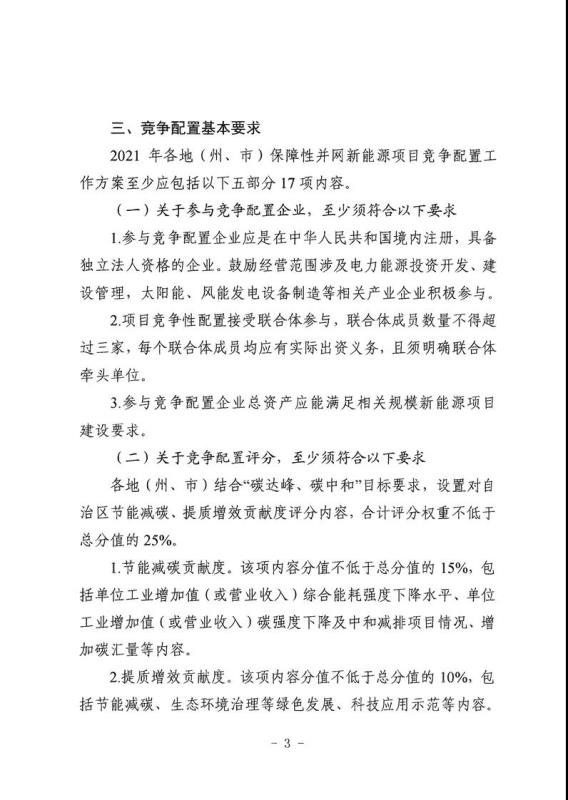 在《新疆維吾爾自治區(qū)2021年保障性并網(wǎng)新能源項目競爭配置指導方案》中提出了五部分共17條要求,包括:減碳排貢獻度(能耗強度下降水平、實施碳強度下降及碳中和項目情況、增加碳匯量)、提質(zhì)增效(節(jié)能減排、綠色發(fā)展)、企業(yè)能力(企業(yè)投資能力、企業(yè)業(yè)績、企業(yè)技術能力、對新能源高質(zhì)量發(fā)展貢獻程度)、資源高效利用(設備先進性、方案合理性、用地集約性)、建設周期(合理推進項目建設)。