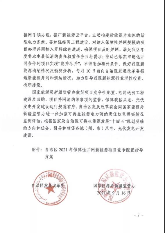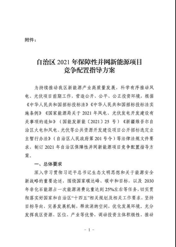 中國儲能網(wǎng)訊:日前,新疆維吾爾自治區(qū)發(fā)改委發(fā)布《關于2021年風電、光伏發(fā)電年度開發(fā)建設方案有關事項的通知(征求意見稿)》及《新疆維吾爾自治區(qū)2021年保障性并網(wǎng)新能源項目競爭配置指導方案》。