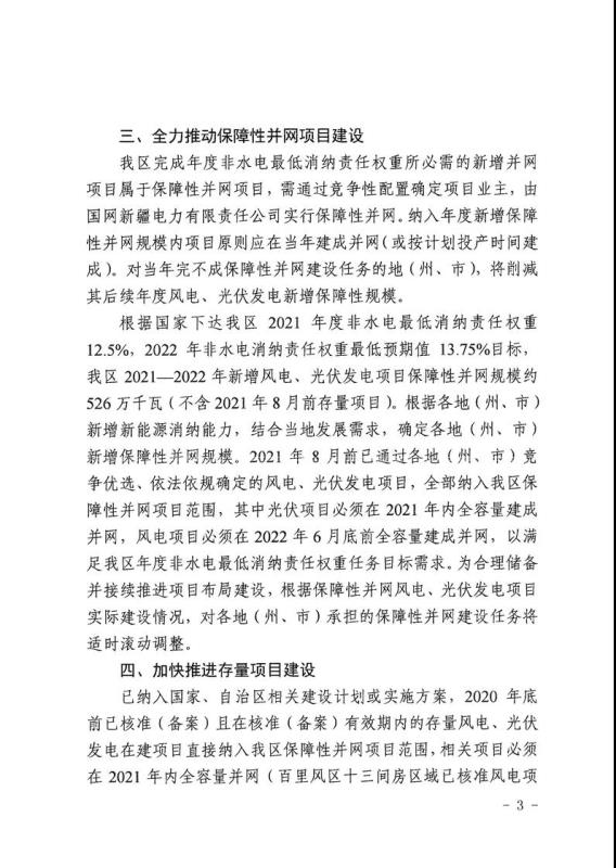 2020年底前已核準(備案)且在核準(備案)有效期內(nèi)的存量風電、光伏發(fā)電在建項目直接納入保障性并網(wǎng)項目范圍,相關項目必須在2021年內(nèi)全容量并網(wǎng)(百里風區(qū)十三間房區(qū)域已核準風電項目必須在2022年6月底前全容量并網(wǎng))。逾期未全容量并網(wǎng)項目不再納入年度保障性并網(wǎng)規(guī)模。