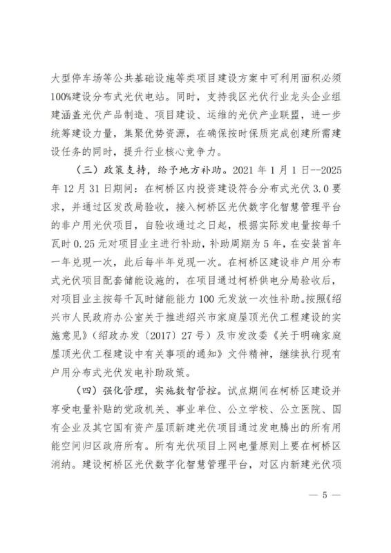 政策方面給予一定的地方補助,2021年1月1日--2025年12月31日期間:在柯橋區(qū)內(nèi)投資建設(shè)符合分布式光伏3.0要求,根據(jù)實際發(fā)電量按每千瓦時0.25元對項目業(yè)主進行補助,補助周期為5年,在安裝首年一年兌現(xiàn)一次,此后每半年兌現(xiàn)一次。在柯橋區(qū)建設(shè)非戶用分布式光伏項目配套儲能設(shè)施的,在項目通過柯橋供電分局驗收后,對項目業(yè)主按每千瓦時儲能能力100元發(fā)放一次性補助。