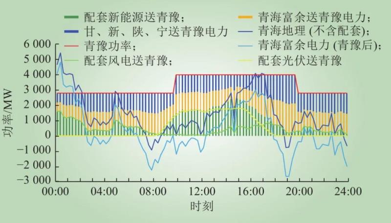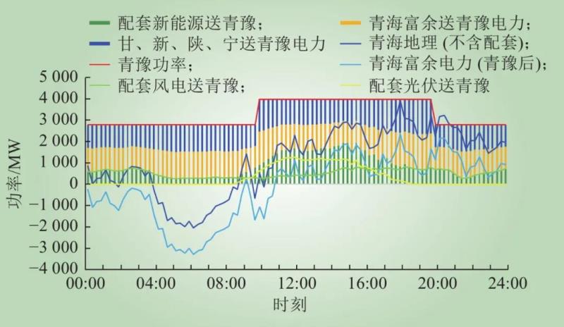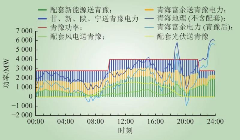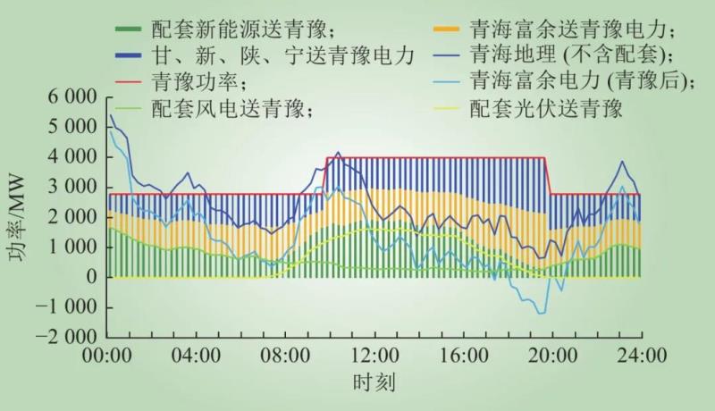 注:圖中各量均為有功電力,其中:設置新能源小發(fā)月份的配套風電、配套光伏曲線;根據(jù)青豫直流打捆方式原則,設置青海地理(不含配套)曲線=青?;痣姵隽?青海水電出力+青海風電出力+青海光伏出力?青海負荷出力?配套風電出力?配套光伏出力;設置青豫直流外送曲線=配套新能源送青豫電力+青海富余送青豫電力+甘、新、陜、寧送青豫電力;配套新能源送青豫=配套風電送青豫+配套光伏送青豫,配套新能源全部通過青豫直流外送;青海富余送青豫電力為青海電網(wǎng)內配套風電和配套光伏之外的通過青豫直流外送的清潔能源;為了測算打捆交易靈活互濟電力,設置青海富余電力(青豫后)=青海地理(不含配套)?青海富余送青豫電力。
