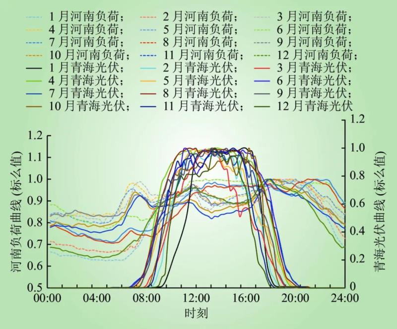 由于青海電網(wǎng)光伏裝機容量大、占比高,對青豫直流外送影響較大,本文重點選取光伏曲線進行比對分析。青豫直流輸電典型曲線設置需兼顧送端青海以光伏為主的發(fā)電特性和受段河南電網(wǎng)負荷特性,根據(jù)青海電網(wǎng)光伏曲線和河南電網(wǎng)負荷曲線的歷史數(shù)據(jù),繪制青海-河南光伏-負荷匹配曲線,如圖5所示。青海光伏出力和河南電網(wǎng)負荷的量級差較大,因此選取標么值進行對比(光伏基準值為月度最大出力、負荷基準值為月度最大負荷)。