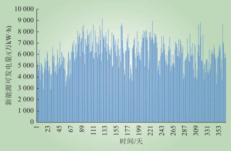 (2)波動性(隨機性)。青海新能源發(fā)電波動性較為明顯,如圖3所示,以年度為周期,典型年新能源日最大可發(fā)電量為9163萬kW?h,日均可發(fā)電量為6177萬kW?h,最小可發(fā)電量為2919萬kW?h,逐日、3天內、一周內新能源可用電量最大波動幅度分別達到4982萬kW?h、4039萬kW?h和5073萬kW?h。全年相鄰日電量波動超過1000萬kW?h的時間占40%,即全年40%的時間需要的調峰量相當于4臺300 MW火電機啟停調峰接納新能源相鄰日的電量波動[17-21]。因此,受風電波動性(隨機性)影響,青豫直流難以實現(xiàn)穩(wěn)定曲線外送。