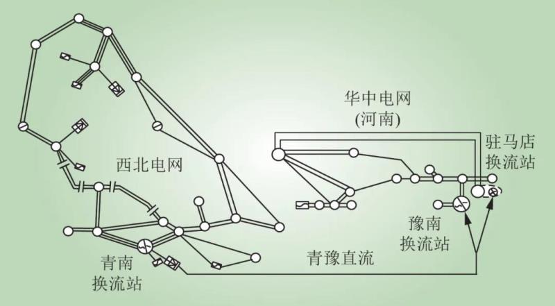 青豫直流送受端接線如圖1所示,青豫直流送端青南站通過6回750 kV線路接入西北750 kV電網(wǎng)。青豫直流受端通過分層接入華中電網(wǎng)1000 kV和500 kV交流系統(tǒng),受端雙高端接入豫南站,雙低端接入駐馬店站,通過500 kV線路和1000 kV主變接入華中電網(wǎng)。