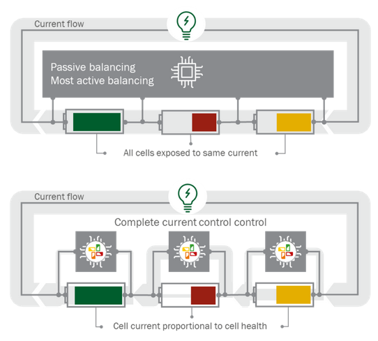完全電流控制的安全好處包括通過減少高電阻電池上的電流來避免形成熱點(diǎn),及時(shí)斷開電池連接及其出現(xiàn)任何可能的故障。這種方法還具有系統(tǒng)級(jí)電壓調(diào)節(jié)的好處,這使得電池能夠與直流電源(如太陽能發(fā)電設(shè)施、燃料電池和其他類型的電池)以及直流負(fù)載(如電動(dòng)汽車充電器)直接集成。孤立地看,這種方法的組件成本高于被動(dòng)平衡的電池管理系統(tǒng)(BMS);但在系統(tǒng)層面來產(chǎn),其成本低于被動(dòng)平衡的電池管理系統(tǒng)(BMS)。