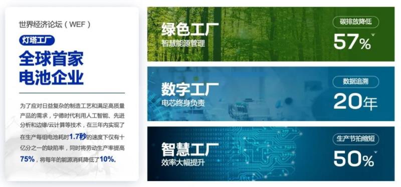 在極限制造方面,今年9月,寧德時(shí)代工廠被世界經(jīng)濟(jì)論壇評(píng)為全球“燈塔工廠”,成為全球首個(gè)獲此認(rèn)可的電池工廠。世界經(jīng)濟(jì)論壇給我們的評(píng)選語是,為應(yīng)對(duì)日益復(fù)雜的制造工藝,滿足高質(zhì)量產(chǎn)品需求。寧德時(shí)代利用人工智能先進(jìn)分析,邊緣計(jì)算和云計(jì)算等技術(shù),可以每1.7秒生產(chǎn)一個(gè)電池,缺陷率僅有十億分之一,同時(shí)將勞動(dòng)生產(chǎn)率提高了75%,能源消耗降低了10%。