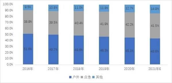 從2016到2021年不同應(yīng)用領(lǐng)域的市場份額來看,戶外應(yīng)用領(lǐng)域仍是主要的應(yīng)用場景,市場占比在40%以上其次是應(yīng)急領(lǐng)域,隨著全球極端天氣的頻發(fā),在地震、海嘯、颶風(fēng)、大火、暴雪等自然災(zāi)害多發(fā)的地區(qū),便攜儲能產(chǎn)品能解決災(zāi)害缺電、停電、應(yīng)急救援等電力短缺問題家庭用戶以及應(yīng)急救援對應(yīng)急電源備用的需求進(jìn)一步增加,將帶動便攜式儲能在應(yīng)急領(lǐng)域的出貨量,其市場份額也有所提升,達(dá)到40%以上在車充、DIY以及電力缺乏等其他領(lǐng)域,隨著鋰電池成本的下降和用戶購買力的提升,其他領(lǐng)域市場的占比也會有所提升。