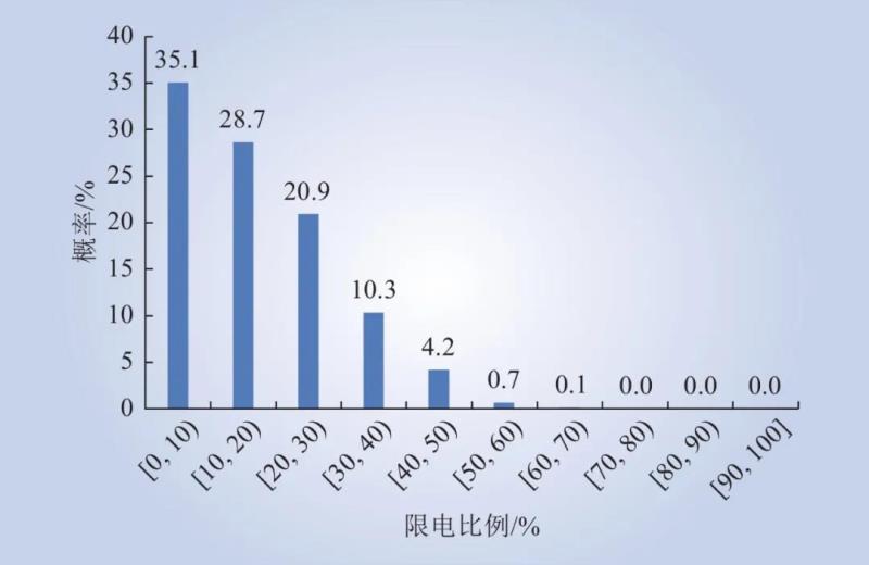 根據(jù)計算,如果不進行電網(wǎng)改造但允許限電,全年8760 h中有764 h存在限電,時段占比為8.7%;限電量占比為10.04%。不同限電比例的概率如圖1所示。