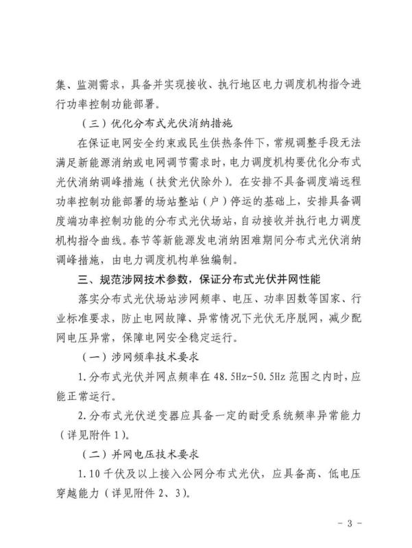2)在保證電網(wǎng)安全約束或民生供熱條件下,常規(guī)調(diào)整手段無(wú)法滿足新能源消納或電網(wǎng)調(diào)節(jié)需求時(shí),電力調(diào)度機(jī)構(gòu)要優(yōu)化分布式光伏消納調(diào)峰措施(扶貧光伏除外)。在安排不具備調(diào)度端遠(yuǎn)程 功率控制功能部署的場(chǎng)站整站(戶)停運(yùn)的基礎(chǔ)上,安排具備調(diào)度端功率控制功能的分布式光伏場(chǎng)站,自動(dòng)接收并執(zhí)行電力調(diào)度機(jī)構(gòu)指令曲線。春節(jié)等新能源發(fā)電消納困難期間分布式光伏消納 調(diào)峰措施,由電力調(diào)度機(jī)構(gòu)單獨(dú)編制。