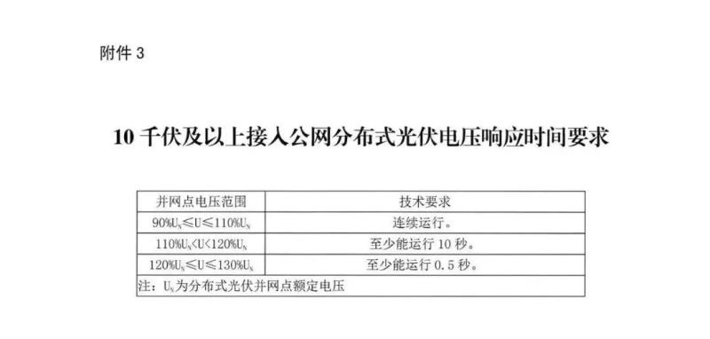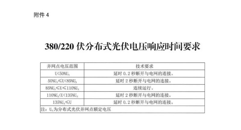 380/220伏以及通過(guò)10千伏接入用戶側(cè)分布式光伏,應(yīng)具備耐受系統(tǒng)異常電壓能力(詳見(jiàn)附件4)。三相系統(tǒng)任一相電壓發(fā)生異常時(shí),也按此方式運(yùn)行。