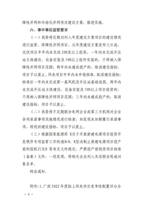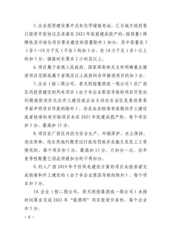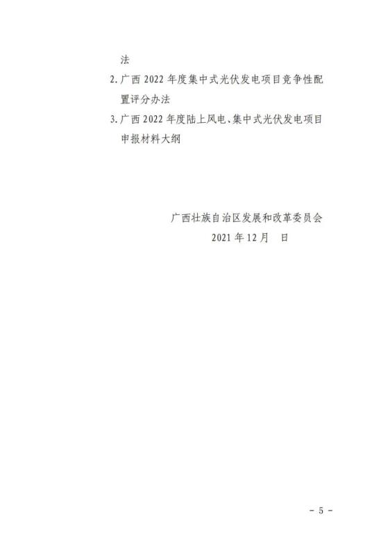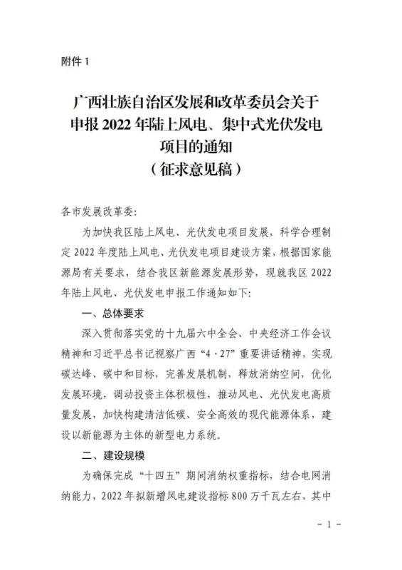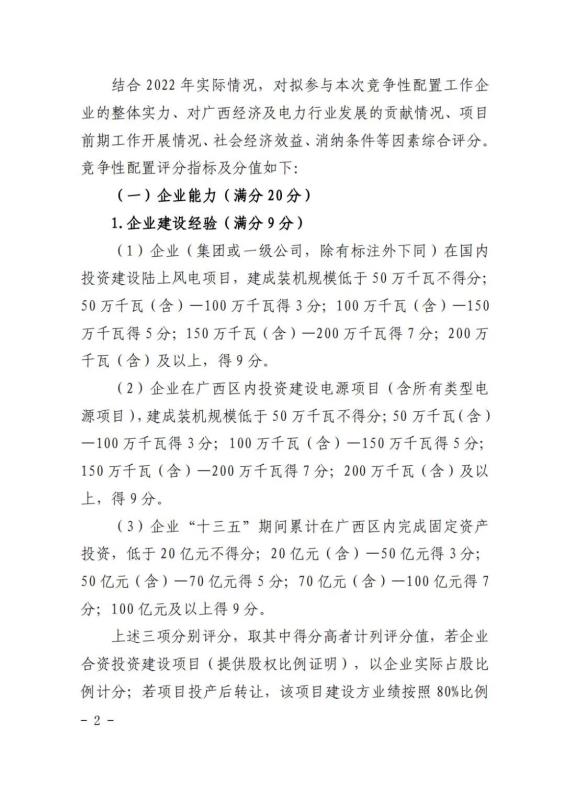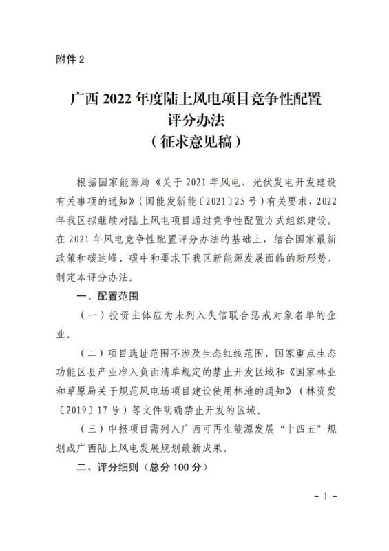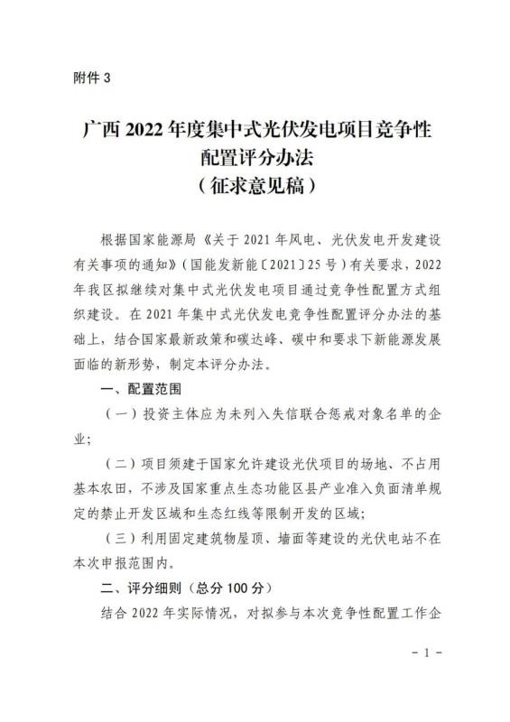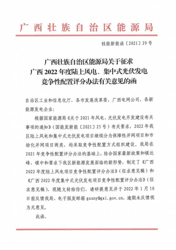 中國(guó)儲(chǔ)能網(wǎng)訊:12月31日,廣西壯族自治區(qū)能源局發(fā)布了關(guān)于征求廣西2022年度陸上風(fēng)電、集中式光伏發(fā)電競(jìng)爭(zhēng)性配置評(píng)分辦法有關(guān)意見(jiàn)的函。廣西2022年擬新增風(fēng)電建設(shè)指標(biāo)800萬(wàn)千瓦左右,其中,保障性并網(wǎng)項(xiàng)目300萬(wàn)千瓦左右,市場(chǎng)化并網(wǎng)項(xiàng)目500萬(wàn)千瓦左右;擬新增集中式光伏發(fā)電700萬(wàn)千瓦左右,其中保障性并網(wǎng)項(xiàng)目200萬(wàn)千瓦左右,市場(chǎng)化并網(wǎng)項(xiàng)目500萬(wàn)千瓦左右。