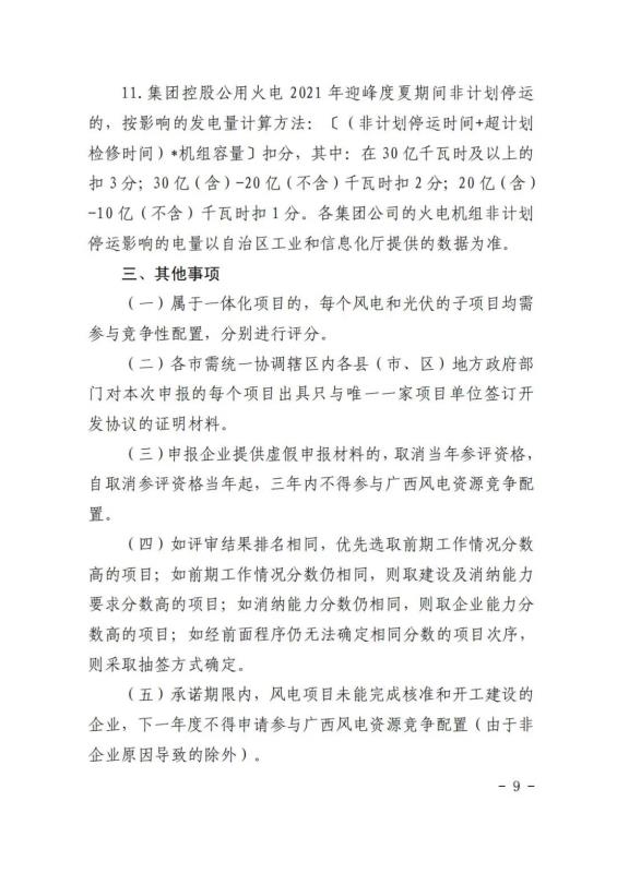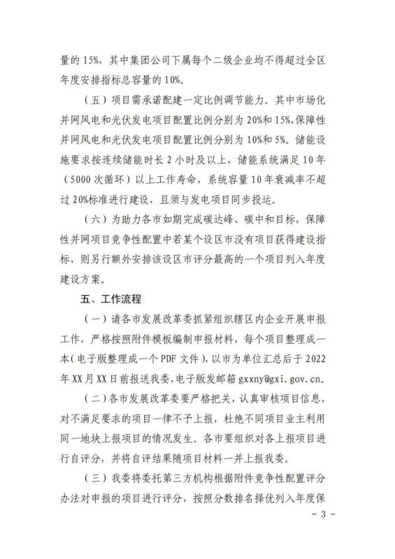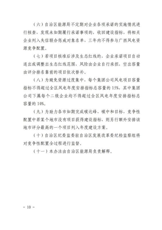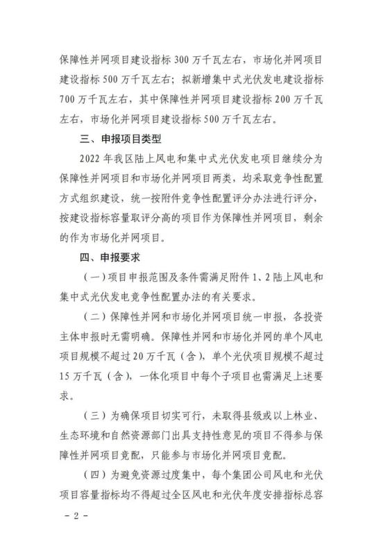 文件規(guī)定單個(gè)風(fēng)電項(xiàng)目申報(bào)規(guī)模不超過(guò)200MW,單個(gè)光伏項(xiàng)目規(guī)模不超過(guò)150MW。為避免資源過(guò)度集中,每個(gè)集團(tuán)公司風(fēng)電和光伏項(xiàng)目容量指標(biāo)均不得超過(guò)全區(qū)風(fēng)電和光伏年度安排指標(biāo)總?cè)萘康?5%,其中集團(tuán)公司下屬每個(gè)二級(jí)企業(yè)均不得超過(guò)全區(qū)年度安排指標(biāo)總?cè)萘康?0%。