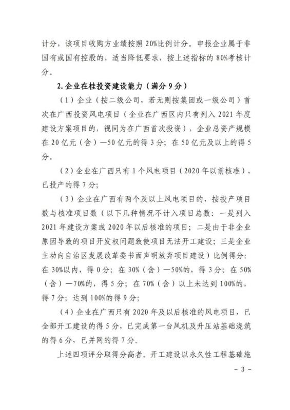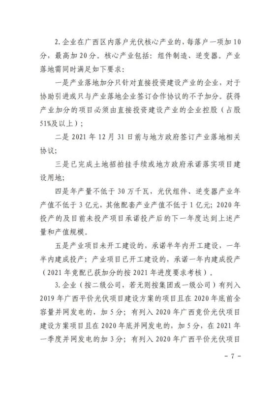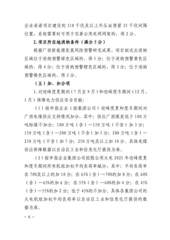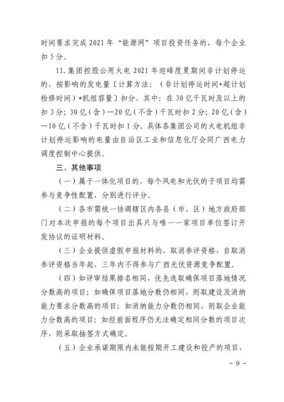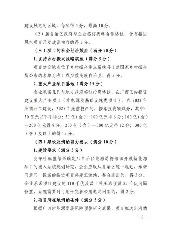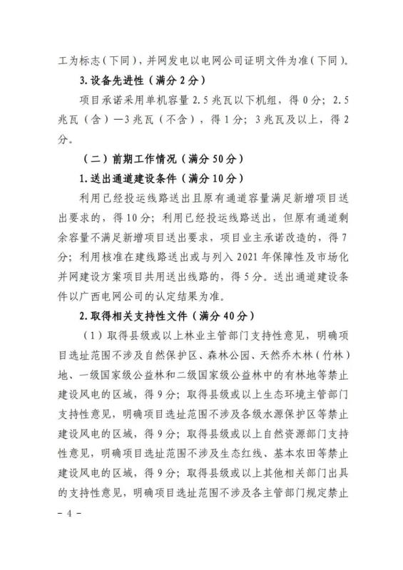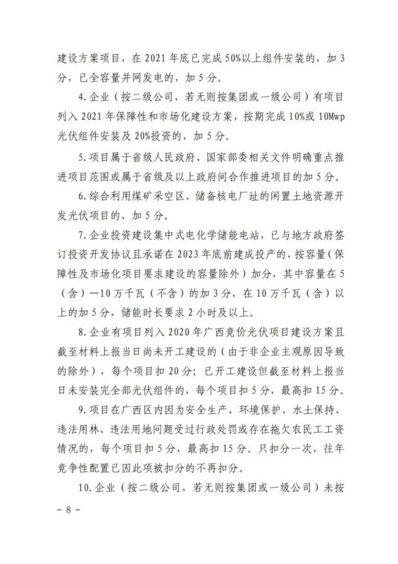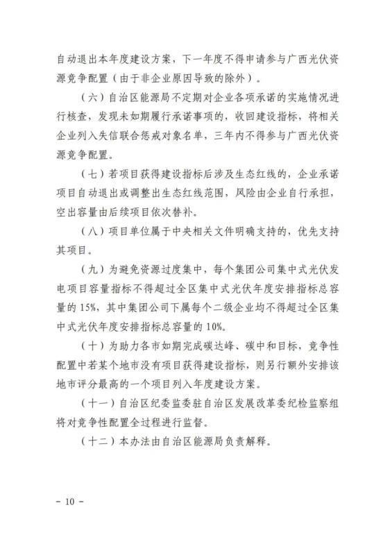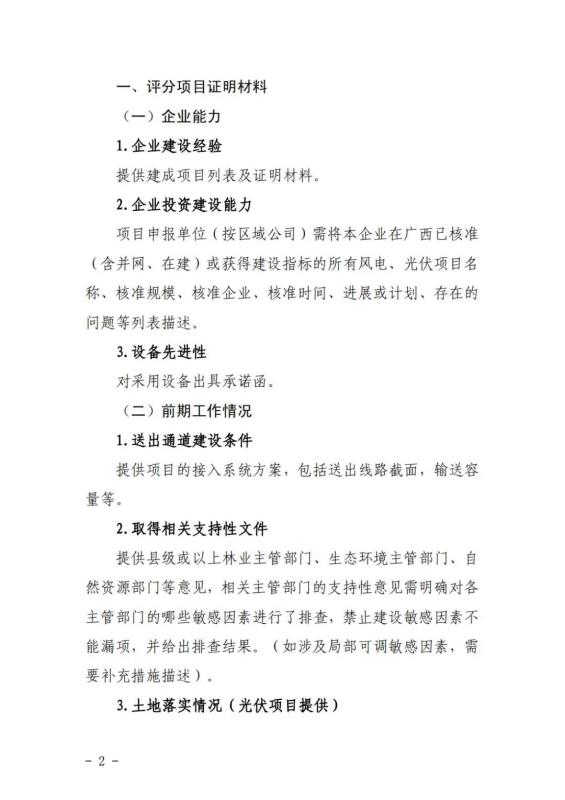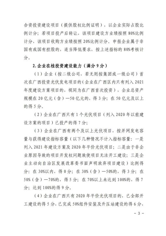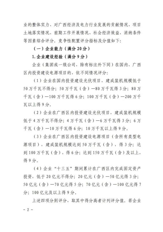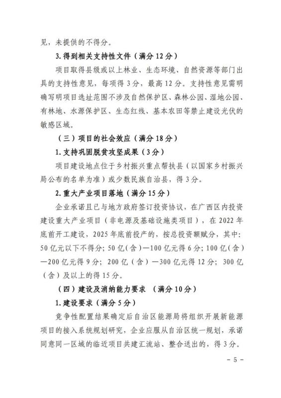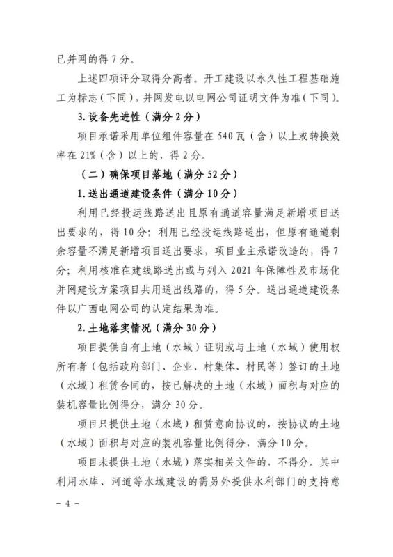 在競(jìng)爭(zhēng)性配置評(píng)分細(xì)則方面:企業(yè)能力占比20%,包括企業(yè)建設(shè)經(jīng)驗(yàn)、在桂投資建設(shè)能力、設(shè)備先進(jìn)性等。光伏項(xiàng)目承諾采用單位組件容量在 540 瓦(含)以上或轉(zhuǎn)換效率在 21%(含)以上;確保項(xiàng)目落地占比52%,包括送出通道建設(shè)、土地落實(shí)情況、相關(guān)支持性文件等等。