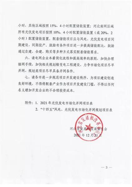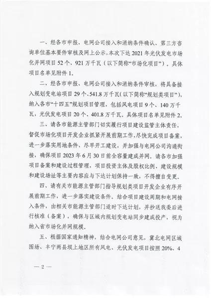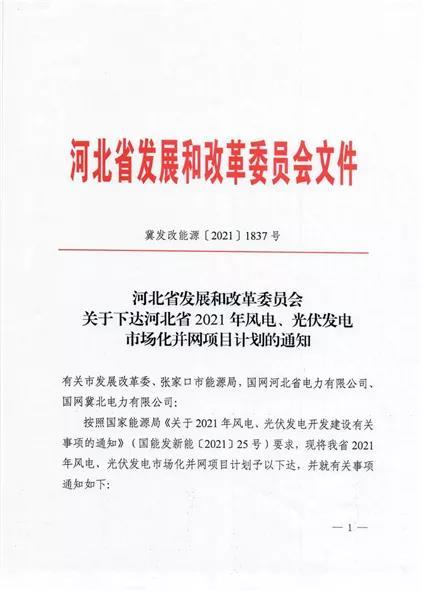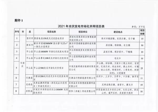 中國(guó)儲(chǔ)能網(wǎng)訊:2021年12月31日,河北省發(fā)改委下發(fā)《關(guān)于下達(dá)河北省2021年風(fēng)電、光伏發(fā)電市場(chǎng)化并網(wǎng)項(xiàng)目計(jì)劃的通知》,下達(dá)了2021年光伏發(fā)電市場(chǎng)化并網(wǎng)項(xiàng)目52個(gè),921萬(wàn)千瓦,以及29個(gè)共計(jì)541.8萬(wàn)千瓦"十四五”風(fēng)電、光伏發(fā)電市場(chǎng)化并網(wǎng)規(guī)劃項(xiàng)目(2024~2025年落地)。
