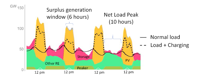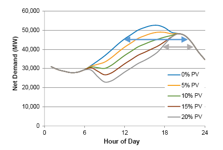 凈負(fù)荷峰值期間的長(zhǎng)度也受到可變可再生能源(VRE)部署的影響,尤其是太陽(yáng)能發(fā)電設(shè)施(PV)。圖3提供了一個(gè)示例,說(shuō)明了儲(chǔ)能系統(tǒng)在沒(méi)有與太陽(yáng)能發(fā)電設(shè)施配套部署的情況下,滿(mǎn)足電力系統(tǒng)峰值需求可能需要8小時(shí)或更長(zhǎng)時(shí)間(藍(lán)色箭頭)的情況。然而,當(dāng)儲(chǔ)能系統(tǒng)從光伏發(fā)電設(shè)施每年獲得20%的發(fā)電量時(shí),這個(gè)儲(chǔ)能系統(tǒng)只需要4小時(shí)的持續(xù)時(shí)間即可實(shí)現(xiàn)與8小時(shí)持續(xù)時(shí)間儲(chǔ)能系統(tǒng)相同的降低凈負(fù)荷水平(灰色箭頭)。