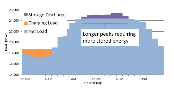 在這一示例中,隨著儲(chǔ)能部署的增加,維持高容量信用需要從4小時(shí)持續(xù)時(shí)間到最終10小時(shí)持續(xù)時(shí)間的系統(tǒng)過(guò)渡。