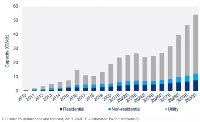 美國的太陽能增長速度驚人且持續(xù)。除了2021年預(yù)計在美國部署的23吉瓦外,研究機構(gòu)標(biāo)準(zhǔn)普爾全球市場情報公司(S& P Global Market Intelligence)還預(yù)測2022年將有44吉瓦的光伏投入使用,與2021年相比幾乎翻了一番。