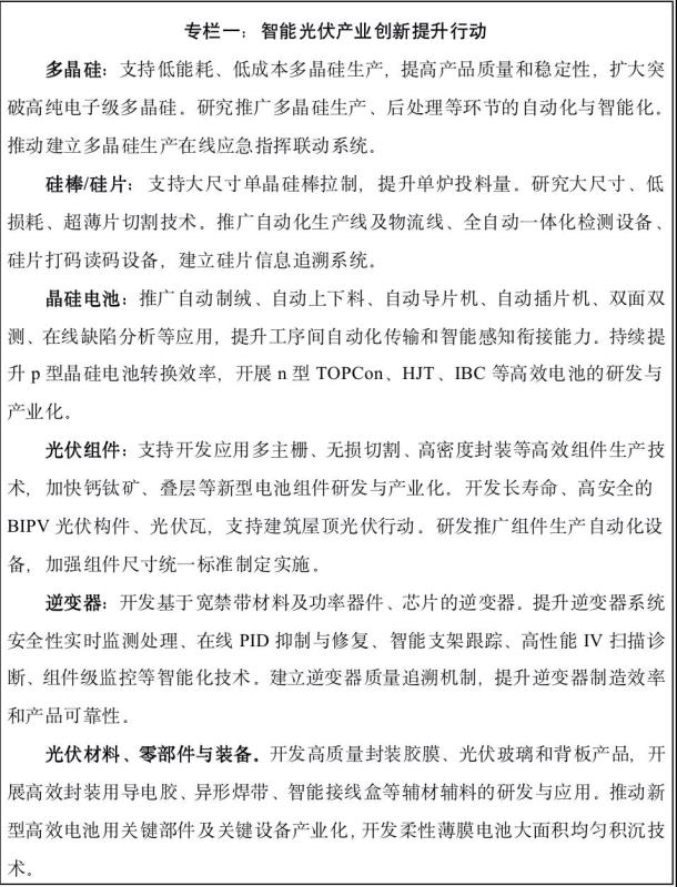 加快產(chǎn)業(yè)技術(shù)創(chuàng)新。推進(jìn)智能光伏產(chǎn)業(yè)鏈技術(shù)創(chuàng)新,加快大尺寸硅片、高效太陽能電池及組件等研制和突破。夯實(shí)配套產(chǎn)業(yè)基礎(chǔ),推動(dòng)智能光伏關(guān)鍵原輔料、設(shè)備、零部件等技術(shù)升級(jí)。開展智能光伏與建筑節(jié)能、交通運(yùn)輸、綠色農(nóng)業(yè)等領(lǐng)域相結(jié)合的交叉技術(shù)研究。