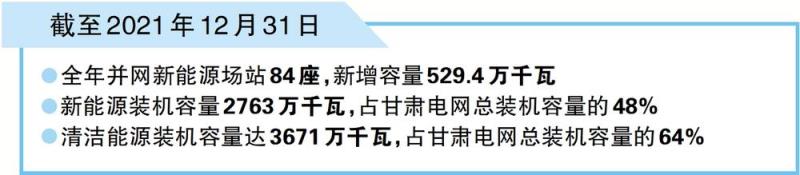 中國儲能網(wǎng)訊:截至2021年12月31日,甘肅電網(wǎng)全年并網(wǎng)新能源場站84座,新增容量529.4萬千瓦,同比增長24%,刷新了國網(wǎng)甘肅省電力公司年度新能源投產(chǎn)歷史紀(jì)錄,其中新增風(fēng)電368.7萬千瓦(45座風(fēng)力發(fā)電廠)、光伏160.7萬千瓦(39座光伏電站)。甘肅電網(wǎng)新能源裝機容量達2763萬千瓦,占全網(wǎng)總裝機容量的48%,清潔能源裝機容量達3671萬千瓦,占全網(wǎng)總裝機容量的64%。