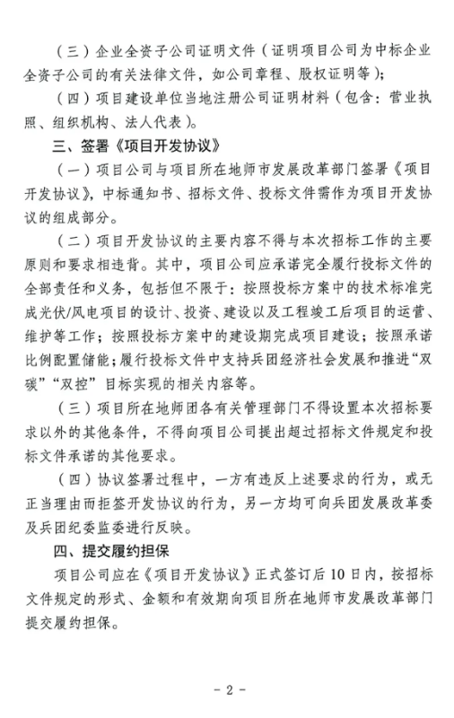 項(xiàng)目公司與項(xiàng)目所在地師市發(fā)改部門簽署《項(xiàng)目開發(fā)協(xié)議》,協(xié)議正式簽訂后10日內(nèi),按招標(biāo)文件規(guī)定的形式、金額和有效期向項(xiàng)目所在地師市發(fā)改部門提交履約擔(dān)保。