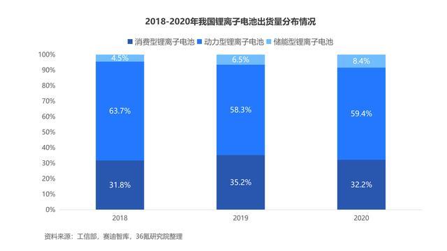 按應(yīng)用領(lǐng)域不同,鋰離子電池主要分為消費(fèi)型、動(dòng)力型和儲(chǔ)能型三大類(lèi)。其中,動(dòng)力型鋰離子電池占主導(dǎo)地位,儲(chǔ)能型鋰離子電池增速較快。具體來(lái)看,根據(jù)賽迪智庫(kù)數(shù)據(jù),2020年,主要應(yīng)用于新能源汽車(chē)、電動(dòng)自行車(chē)、電動(dòng)工具三大市場(chǎng)的動(dòng)力型鋰離子電池出貨量達(dá)94.1GWh,占鋰離子電池總出貨量的59.4%;廣泛應(yīng)用于儲(chǔ)能電站、5G 基站等領(lǐng)域的儲(chǔ)能型鋰離子電池出貨量為13.4GWh,同比增長(zhǎng)55.8%。