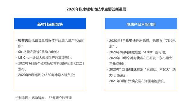 一方面,為提升鋰離子電池能量密度,同時(shí)達(dá)到控制生產(chǎn)成本目的,國(guó)內(nèi)外知名企業(yè)開(kāi)始加速低鈷乃至無(wú)鈷正極材料、硅基負(fù)極材料等新材料在鋰離子電池生產(chǎn)研制過(guò)程中的應(yīng)用。另一方面,2020年以來(lái),隨著寧德時(shí)代、比亞迪、LG化學(xué)等產(chǎn)業(yè)龍頭企業(yè)持續(xù)推進(jìn)技術(shù)研發(fā)與創(chuàng)新,高鎳低鈷電池、硅負(fù)極材料電池、“永不起火”[1]電池、固態(tài)電池等創(chuàng)新產(chǎn)品得到快速發(fā)展。